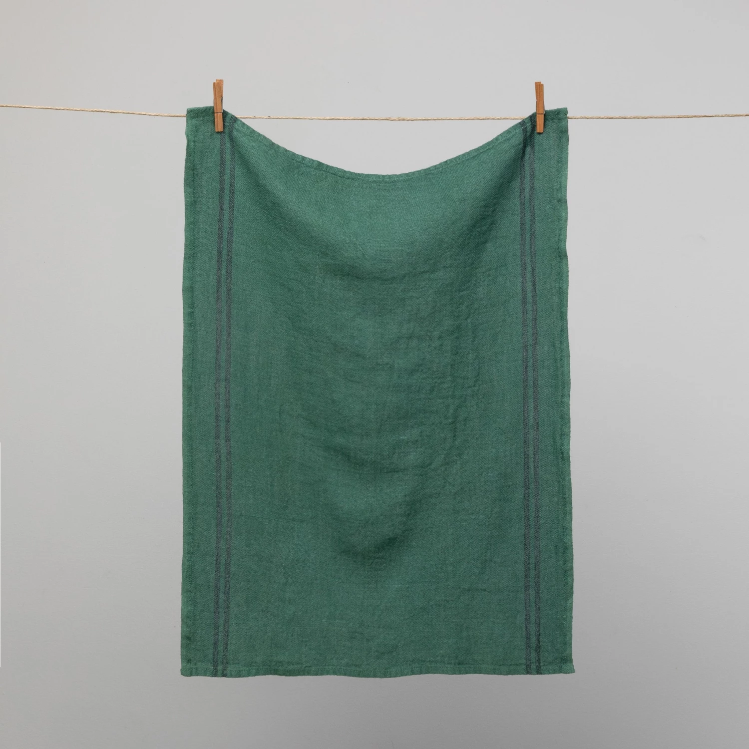 Beautiful French tea towel inĀ forest greenĀ with four blackĀ stripes.Ā Beautifully made, the perfect Parisian addition to the kitchen.
