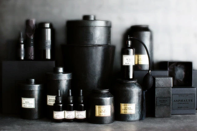 Containers are made from hand hammered wrought steel, copper and black apothecary style glass and stored inside refined hand made packaging.