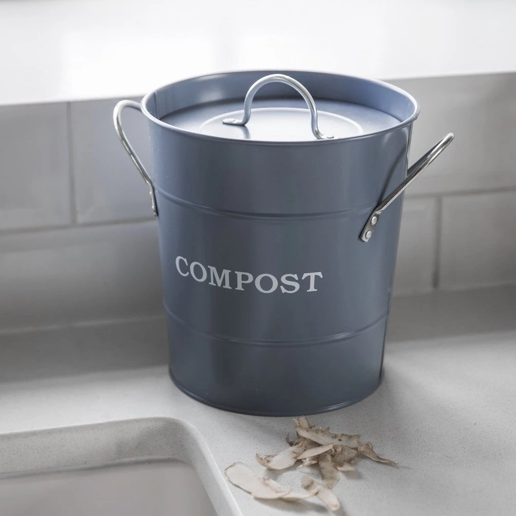 This English compost bin has a plastic liner with handle that pulls out. Keeping the metal clean and able to wash easily.