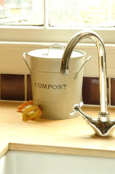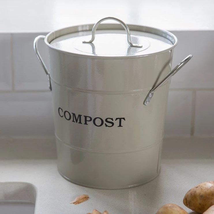 This English compost bin has a plastic liner with handle that pulls out. Keeping the metal clean and able to wash easily.