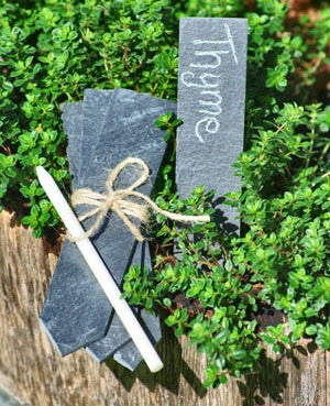 Set of four slate plant labels with white chalk pencil.Â
