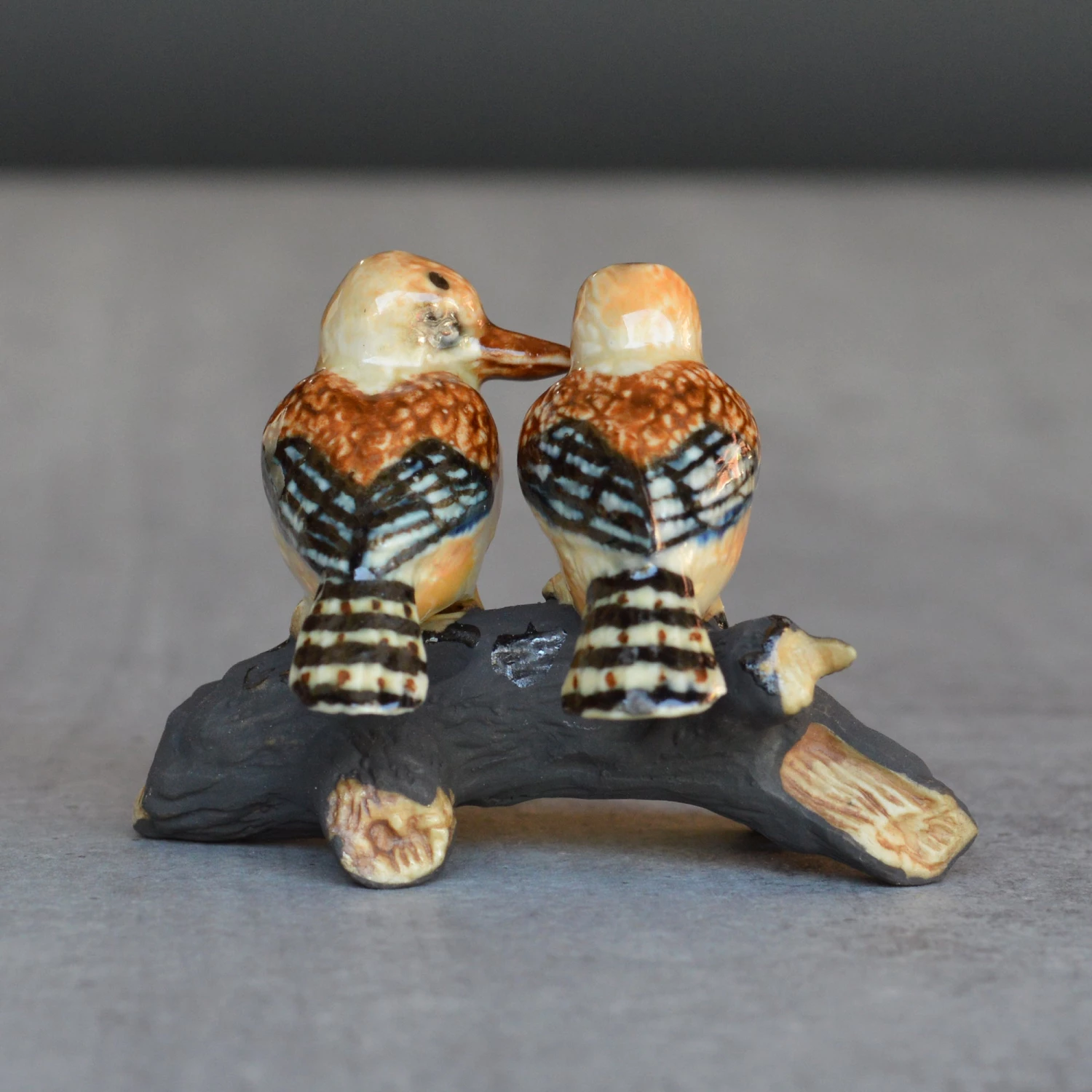 Cute little ceramic and hand painted miniature Kookaburra pair on a branch. Perfect for little gardens and shelves.