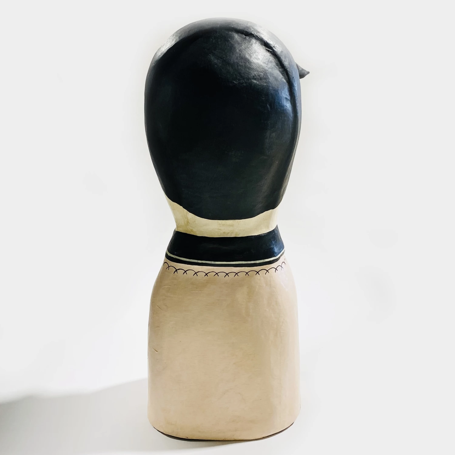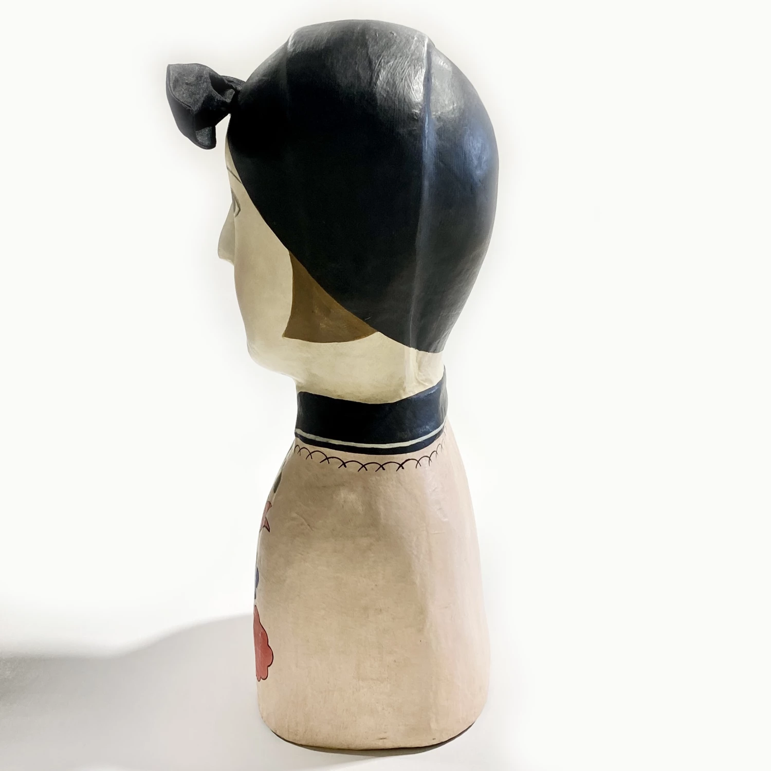 The head is made of moulded papier maché with applied and hand made painted features.