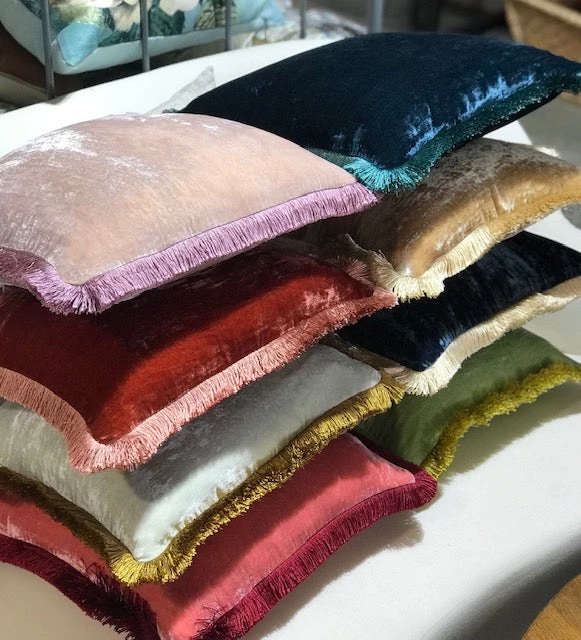 AÂ radiant silk velvet pillow that is hand-dyed in a deep indigo blue hue with a golden fringed trim.