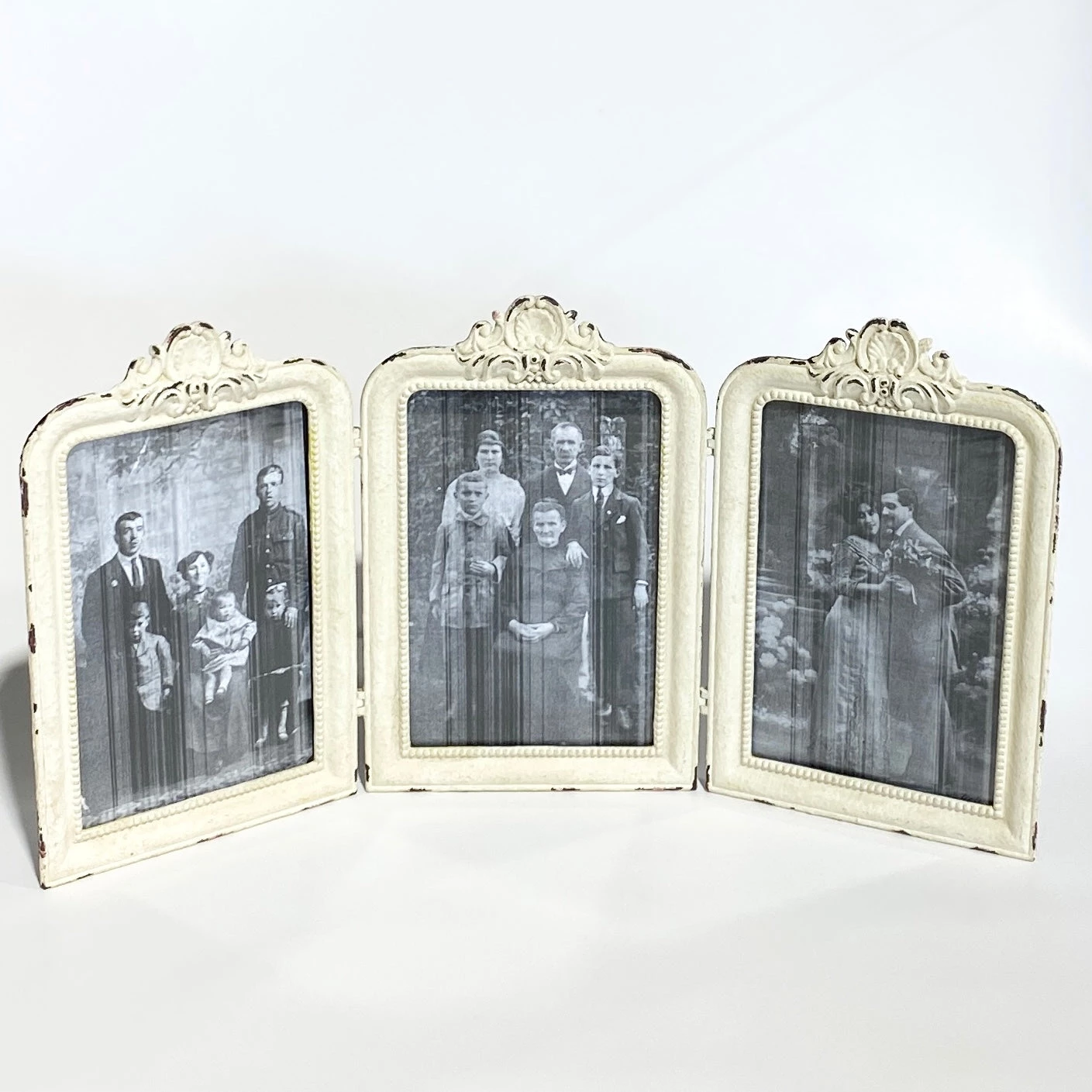 Antique ivory hinged triptych frame perfect for displaying family photos, get creative and display your photos rather than leaving them in your phone!