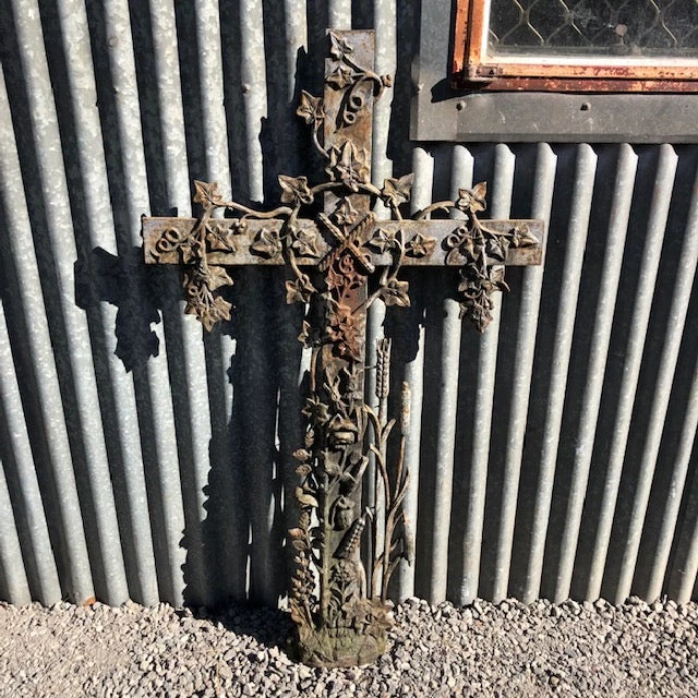 Vintage cast iron French crucifix draped in ivy and wheat.