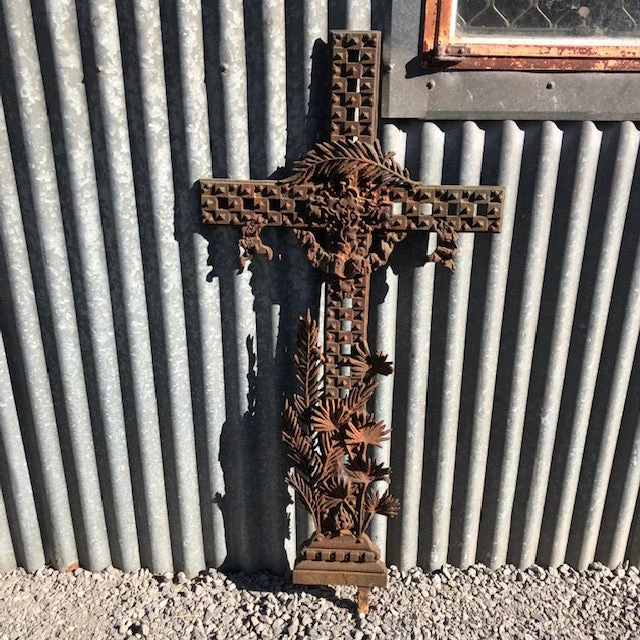 Vintage cast iron French crucifix with a unique texture and fern motif.